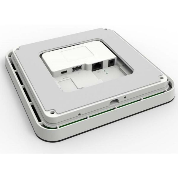 | Aansluitingen | Ethernet RJ45 (LAN) PoE (Power over Ethernet) – voeding en netwerk via één kabel DC Power Port (optioneel, voor externe adapter), WiFi 802.11 a/b/g/n/ac, GPIO-poort (voor externe triggers/sensoren) Micro-USB servicepoort Omgevingssensor (nadertoon—activeert display) LED statusring rondom scherm |